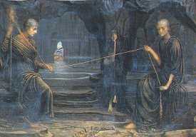 CREENCIASLas Parcas están consideradas como "mensajeras de la muerte" y su función principal consiste en tejer y destejer el hilo de la vida, tal vez por eso, la tradición popular las designa con el nombre de "Hilanderas" y finalmente, cortarlo en el instante mismo en que la hora postrera llega. Se constituían, según los clásicos, en la "Tria Fata" o los "tres destinos"; y personificaban los tres acaeceres excepcionales: nacimiento, casamiento y muerte.